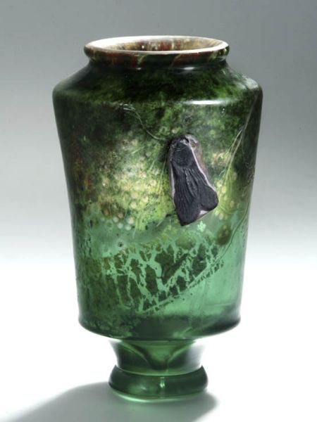 Emile Gallé (1846–1904): Like many of his contemporaries, Nancy-based Emile Gallé was an enthusiastic disciple of East Asian art. Of particular importance for him was his friendship with the Japanese natural scientist and draughtsman Tokouso Takashima, who was in Nancy from 1885 to 1888 for study purposes. Gallé developed a glass style of his own known as the Gallé genre, which drew on many different influences and indeed became emblematic of Art Nouveau in Lorraine. It combined decoration and technology, nature motifs and colour effects in a way that was new to the art fashion of the time. All symmetry and regularity was dispensed with. Gallé’s view of nature was strongly coloured by his interest in botany. He sought to capture mood, using the play of colour and light that only glass could offer. A particular colour effect is achieved in this vase through the metal foil overlaid with green glass.