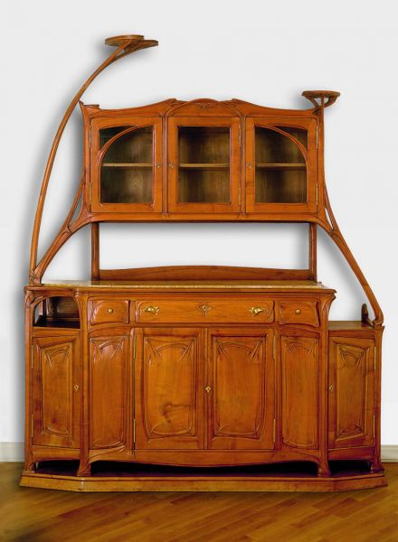 Hector Guimard (1867–1942) is considered one of the major architects and all-round designers of French Art Nouveau. Influenced by the filigree patterns of Gothic art, which became popular towards the end of the 19th century thanks to Viollet-le-Duc and the enthusiasm for nature of early Art Nouveau, which sought inspiration in the structure of plants, he designed extravagantly curvaceous flower sculptures that are still a prominent feature of the urban landscape of Paris. He it was who designed the cast-iron entrances to the first metro stations in time for the world exhibition in 1900. The buffet with the water lily leaves and stems was designed for the Castel Henriette villa in Sèvres. The dynamic language of natural shapes is again the model for Guimard here. The plant patterns develop out of the body of the buffet in vertical, organic curves. This asymmetrically designed piece of furniture almost seems like a plant sculpture. The choice of cherry wood, too, sets it wholly apart from the heavy, imitative furniture styles of historicism.