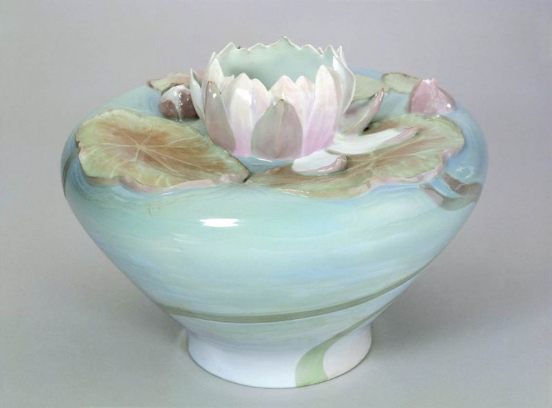 Per Algot Eriksson (1868 – 1937): Sweden played a considerable part in the international artistic debate associated with the reform movement around 1900, thanks to the output of the Rörstrand porcelain factory in Stockholm. The factory’s artistic director was the painter and versatile handicrafts designer Alf Wallander (1862–1914). Under his artistic aegis, he developed a special style of porcelain that was shown at the major exhibitions of the day–particularly in Germany—to great acclaim. A characteristic of the new porcelain creations was the rendering of plant decoration in relief or the three-dimensional form of flowers and plants. The delicate coloration of the blue and green tones gives these one-off pieces an especially delicate and decorative look. The large baluster pot is a graceful representation of an underwater world. The large, open bloom of the water lily is developed in three dimensions, like the typical leaves and buds resting on the shoulder of the vase, while the roots and stems that reach down into the depths of the water are shaped in light relief in the delicate range of blue tones of the water.