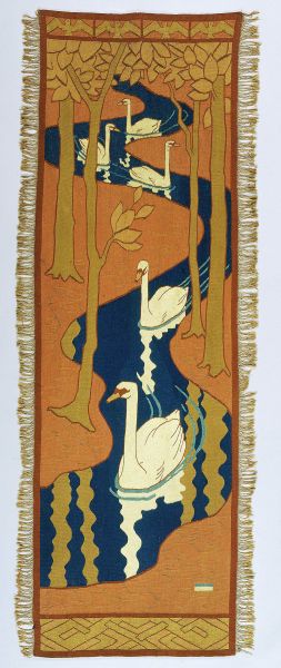 Otto Eckmann (1865–1902): The art weavers’ college at Scherrebek (now Skærbæk, Denmark) was founded in 1896 in the wake of the fin-de-siècle art reform movement. Particularly in the countries of northern Europe, there was a new enthusiasm for textile art. Tapestries reached high artistic standards and became outstandingly important as an integral component of interior design. Around 1894, Otto Eckmann, who was originally a painter, resolutely put down his brushes in favour of applied art—a decision that was taken by numerous artists of the generation around 1900. The aesthetic design of the totality of solid objects proved to have greater appeal than the specialised field of painting. Eckmann became famous as a designer not only of book art and typography, but also of furniture and metal items. The Swans tapestry one of the most successful designs of the weaving college at Scherrebek—combines modern design principles with East Asian influences, a combination that would prove to be one of the principal artistic currents of the Art Nouveau movement. Abstraction, stylisation and aesthetic priorities were borrowed from Japanese art. In this case, Eckmann even went so far as to adapt the tall, narrow format of a Japanese kakemono (roll picture).